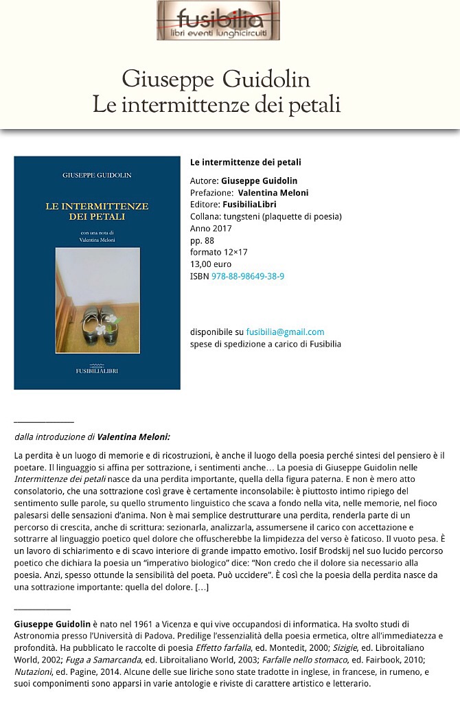 Queste ‘intermittenze’ di versi nascono da brevi visioni e percezioni, come intime contemplazioni di un “momentaneo schiudersi di petali sulla corolla di un fiore”. Ad ogni petalo che si distende corrisponde idealmente un frammento d’emozione, un fermento di poesia in cui può specchiarsi un ritaglio, un istante da cogliere denso di verità, tragica o sublime, che coltiva ed esaurisce un senso … un’ “intermittenza” di vita